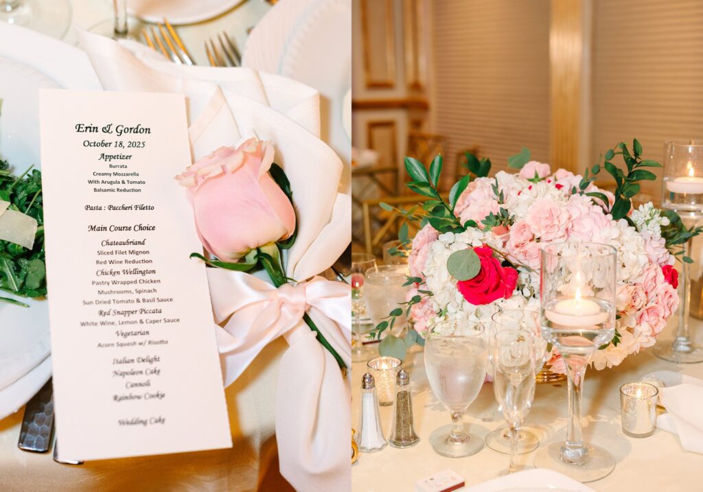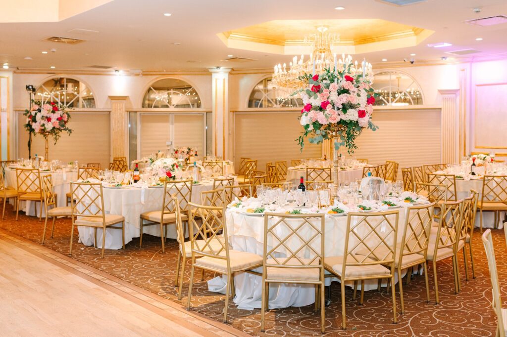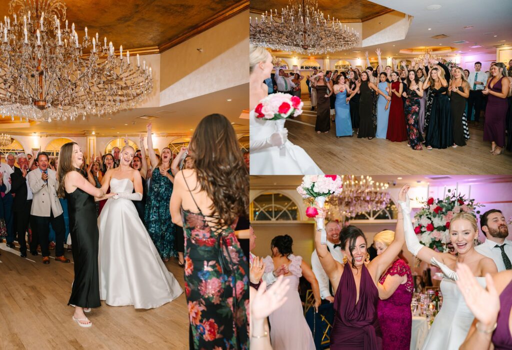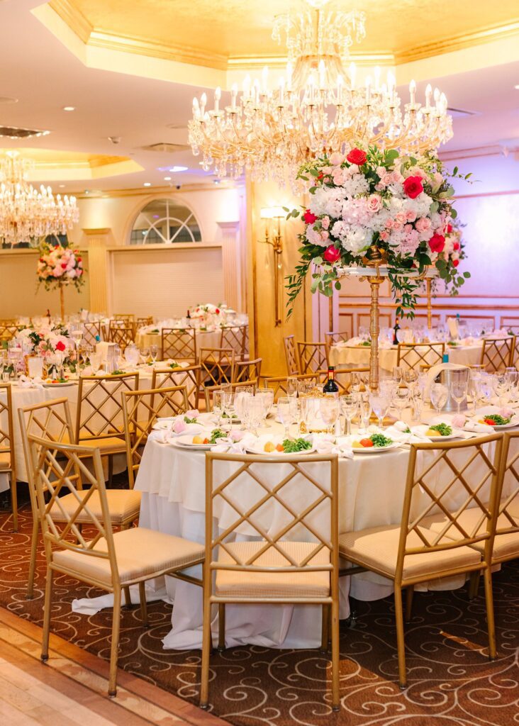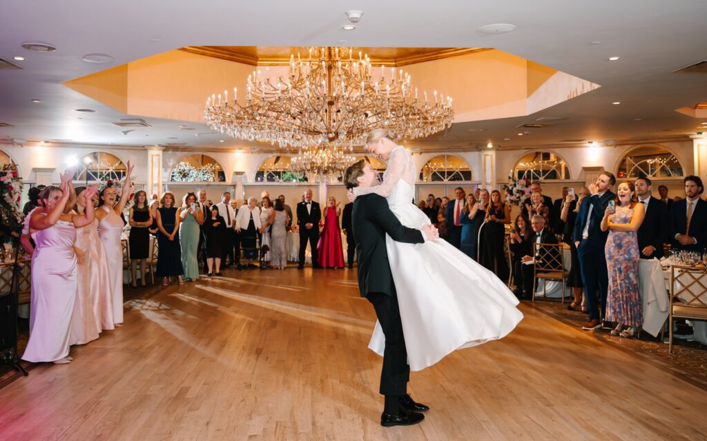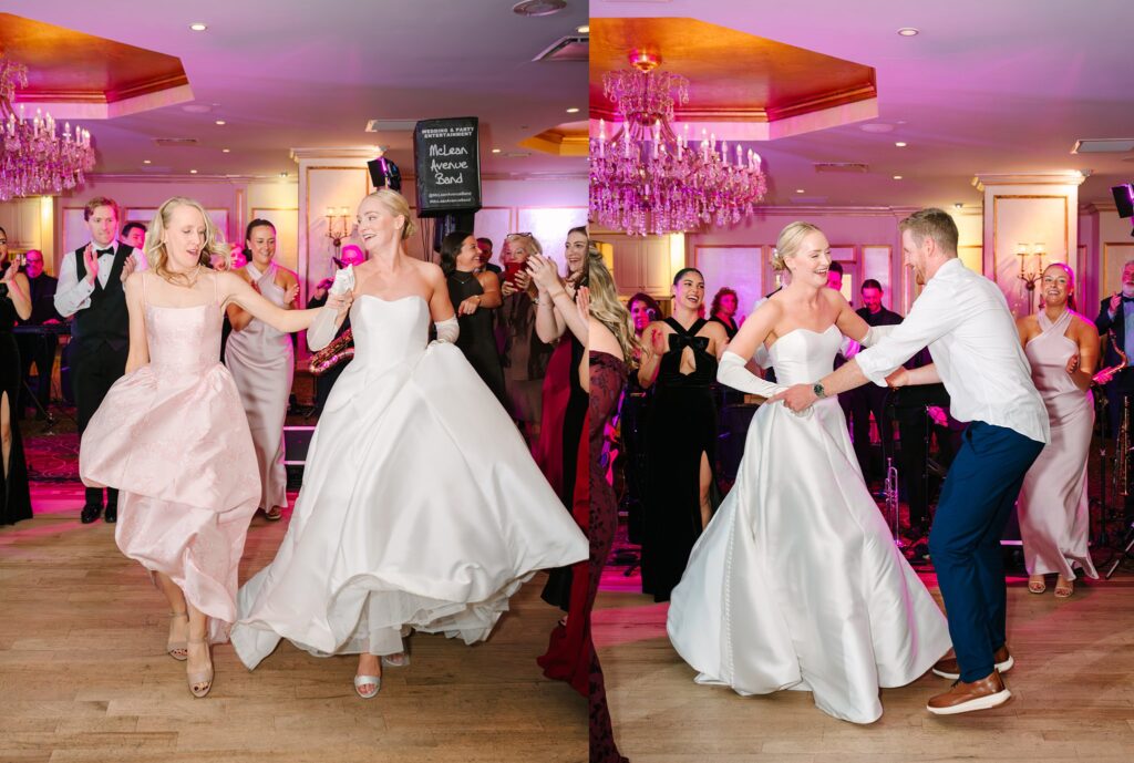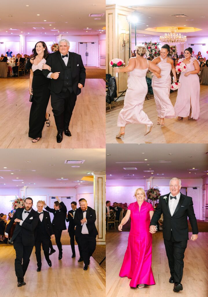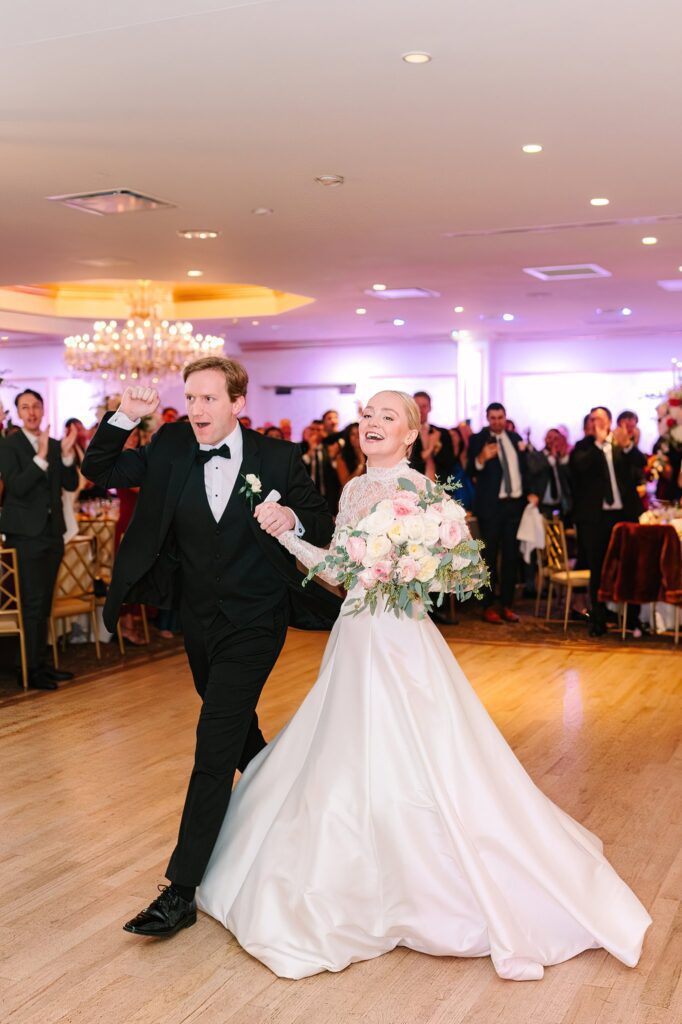 As the cocktail hour came to a close, and guests entered the ballroom. Guests were greeted with a timeless setting for their reception, adorned with crystal chandeliers and soft pink and white florals. Erin and Gordon’s joyful entrance set the tone for an evening filled with celebration, culminating in a packed dance floor that carried the energy well into the night!