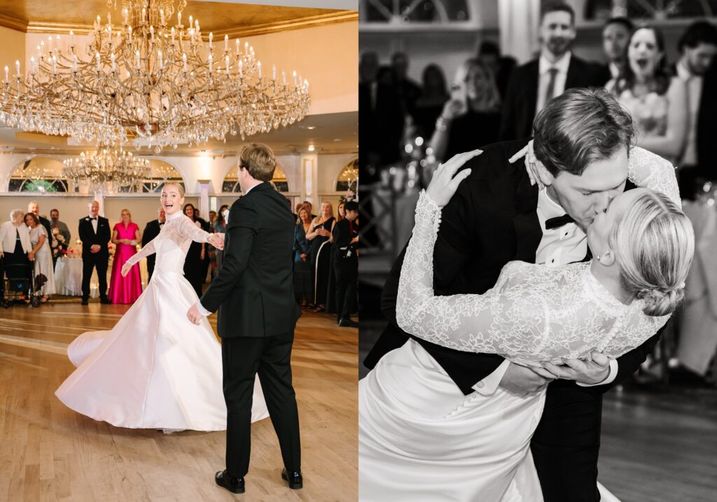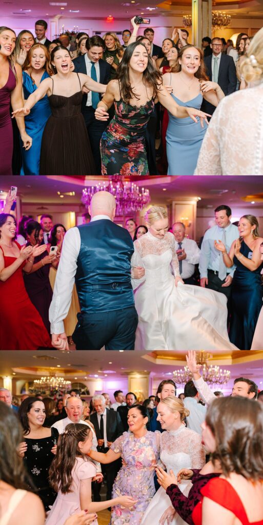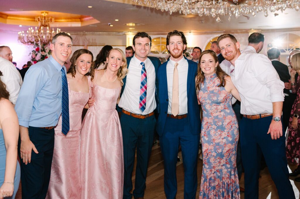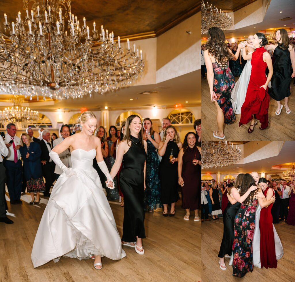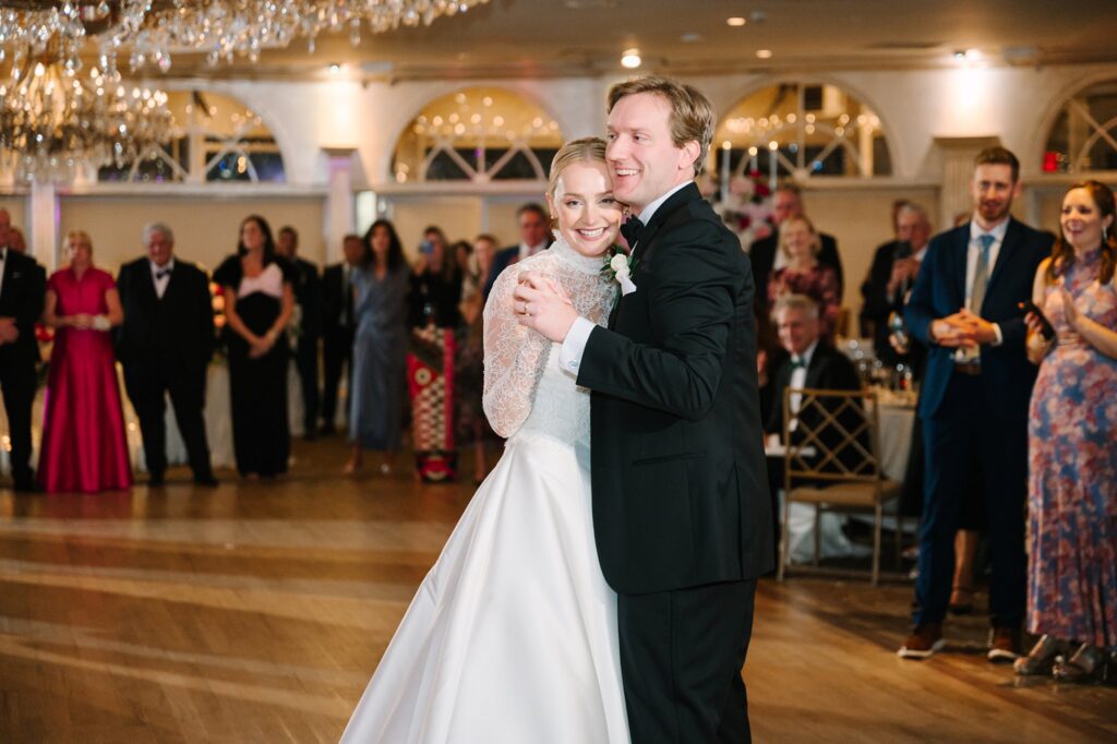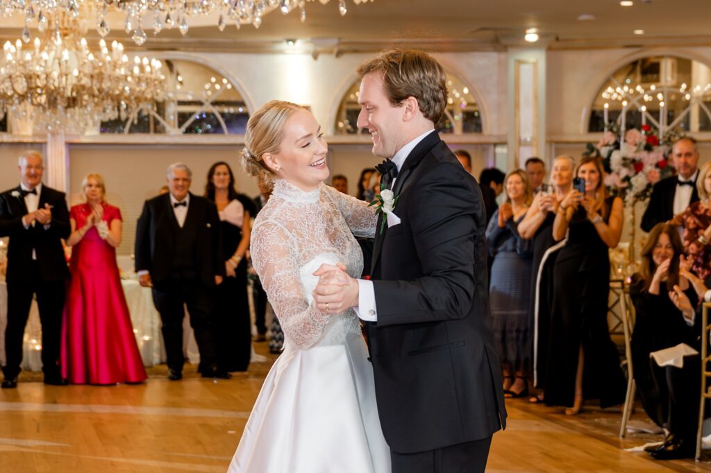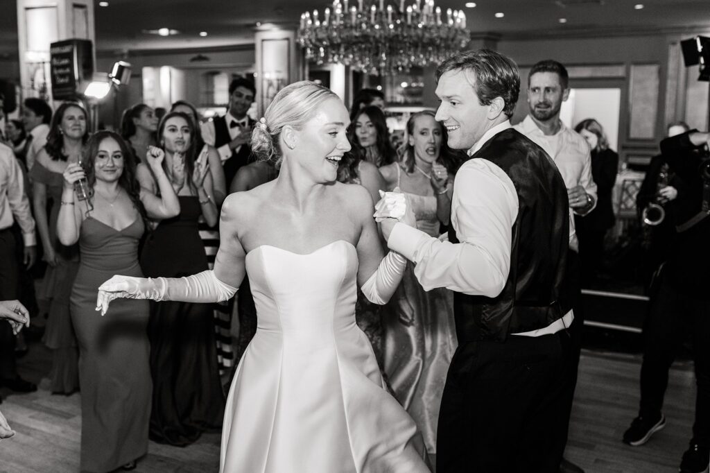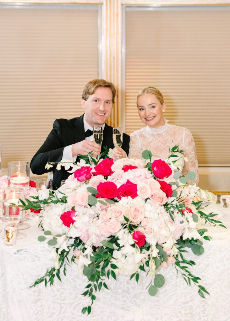 As the cocktail hour came to a close, and guests entered the ballroom. Guests were greeted with a timeless setting for their reception, adorned with crystal chandeliers and soft pink and white florals. Erin and Gordon’s joyful entrance set the tone for an evening filled with celebration, culminating in a packed dance floor that carried the energy well into the night!