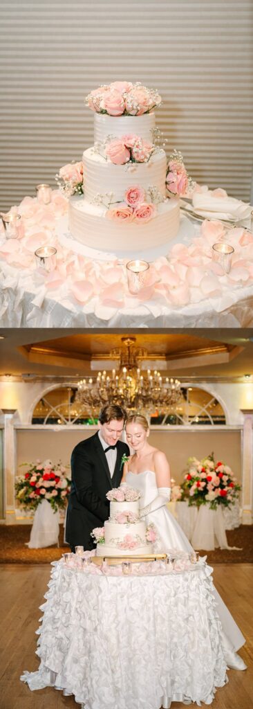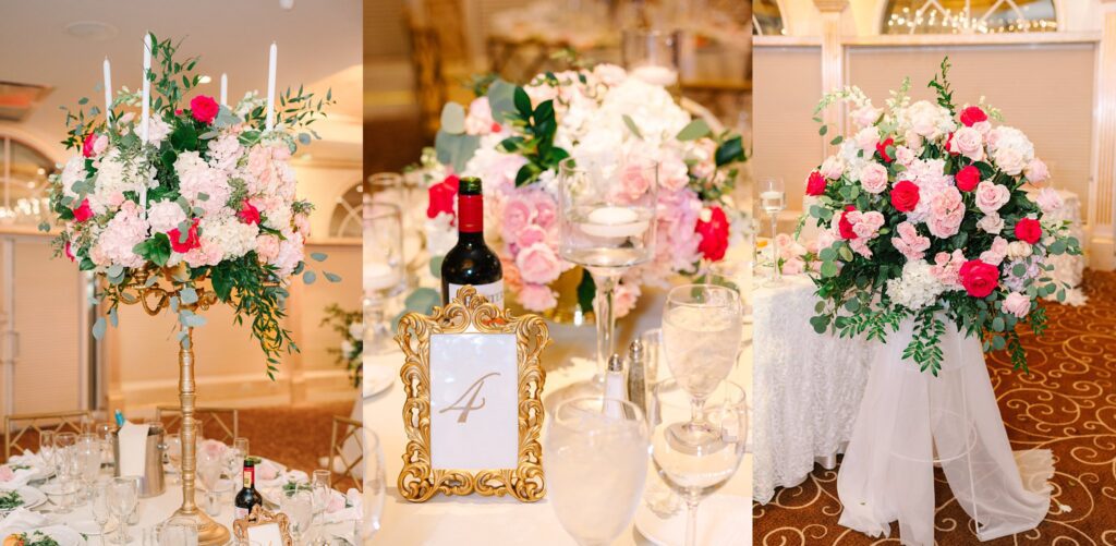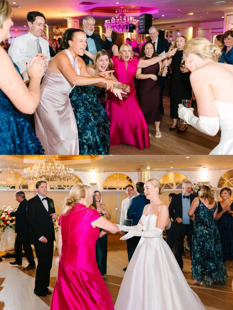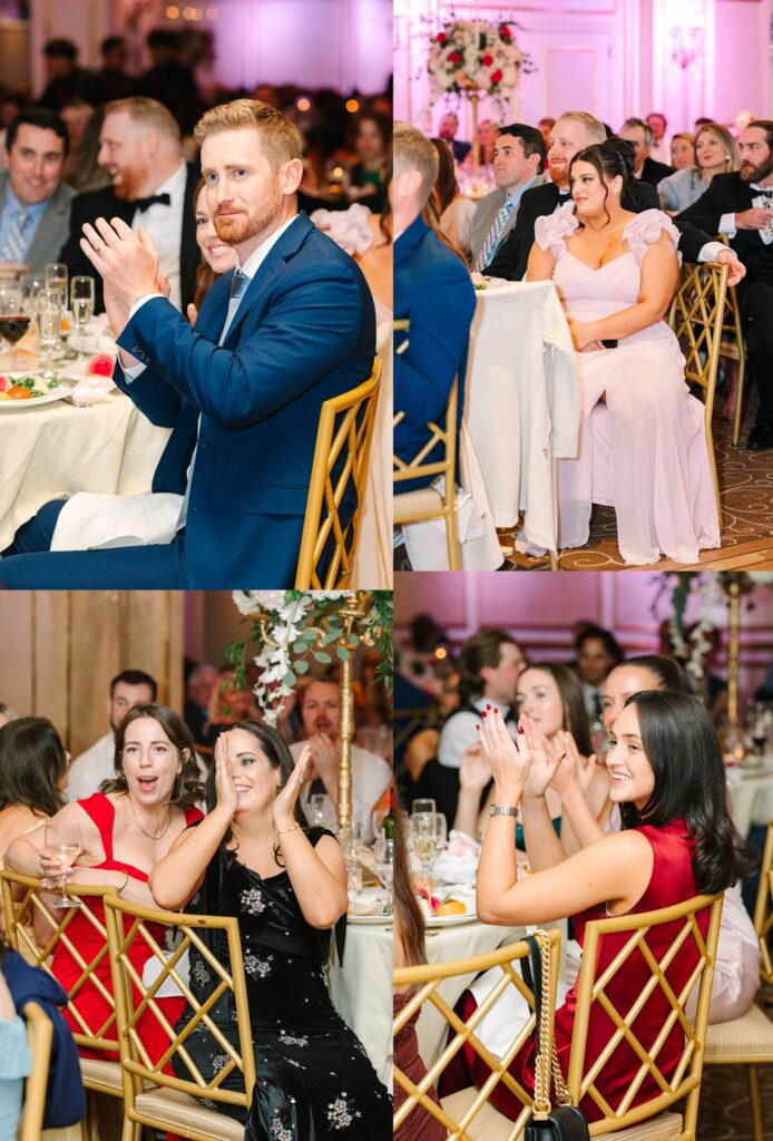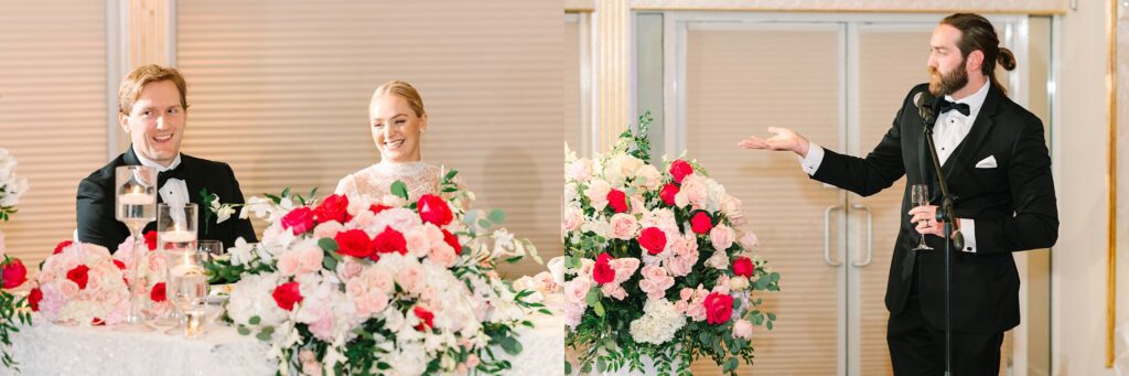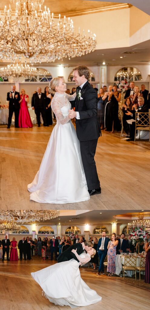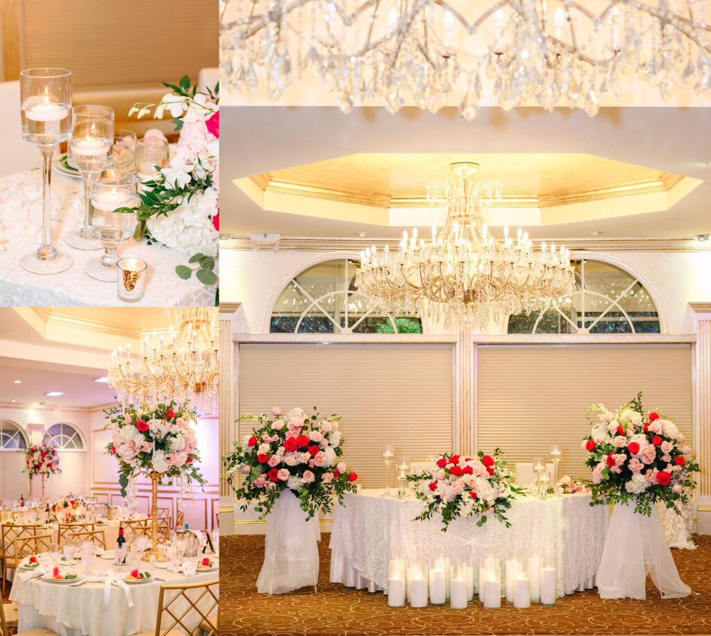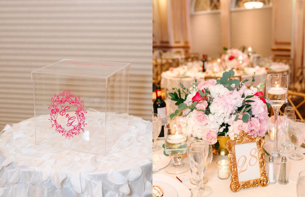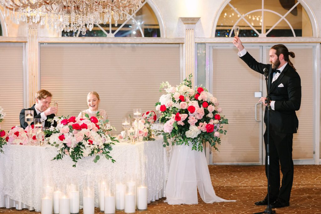 As the cocktail hour came to a close, and guests entered the ballroom. Guests were greeted with a timeless setting for their reception, adorned with crystal chandeliers and soft pink and white florals. Erin and Gordon’s joyful entrance set the tone for an evening filled with celebration, culminating in a packed dance floor that carried the energy well into the night!