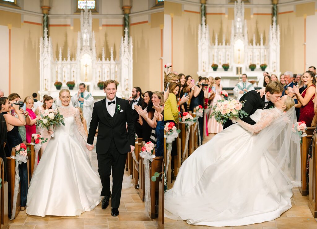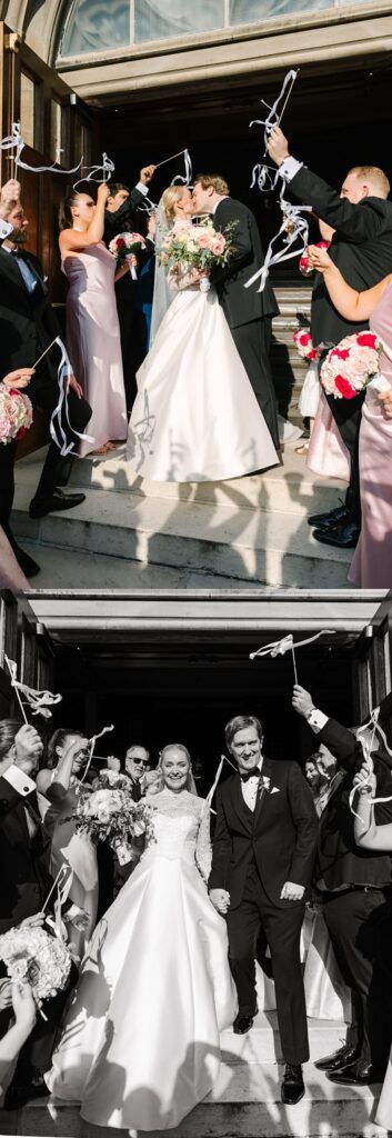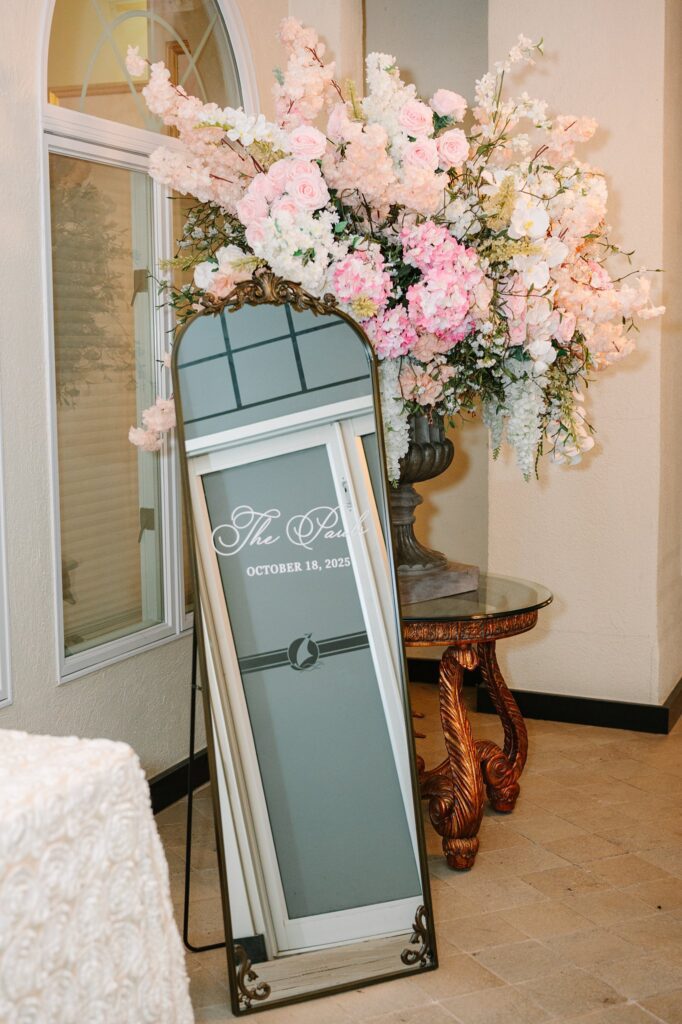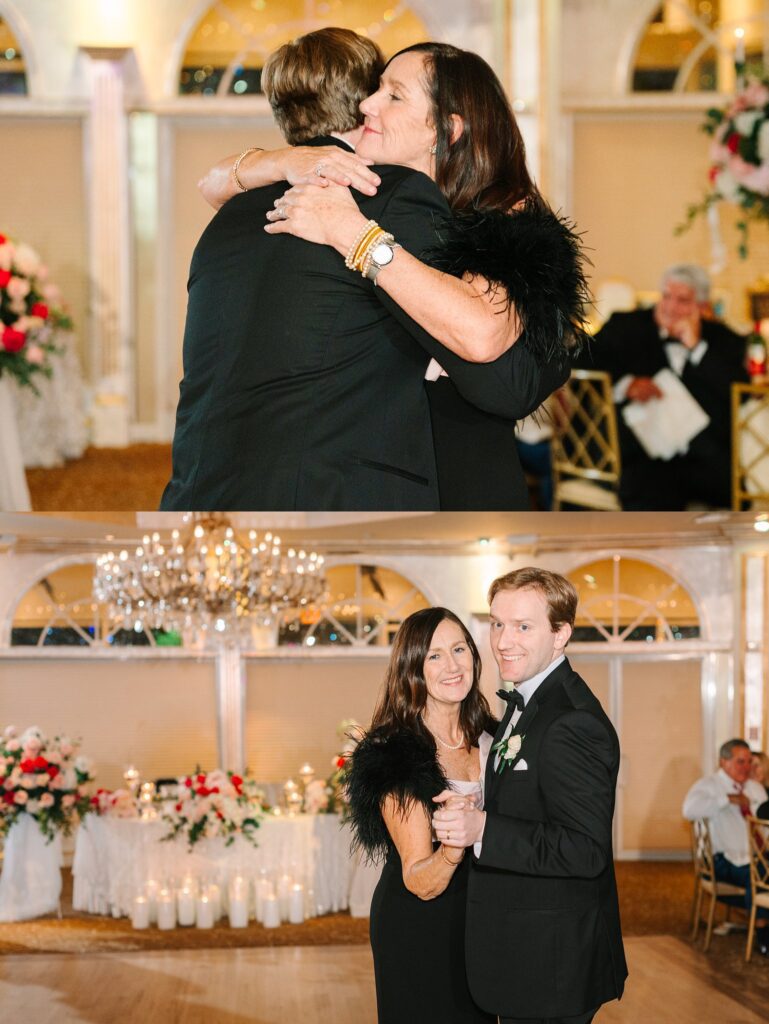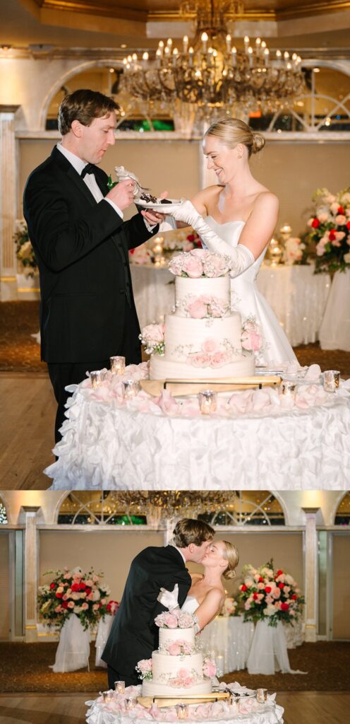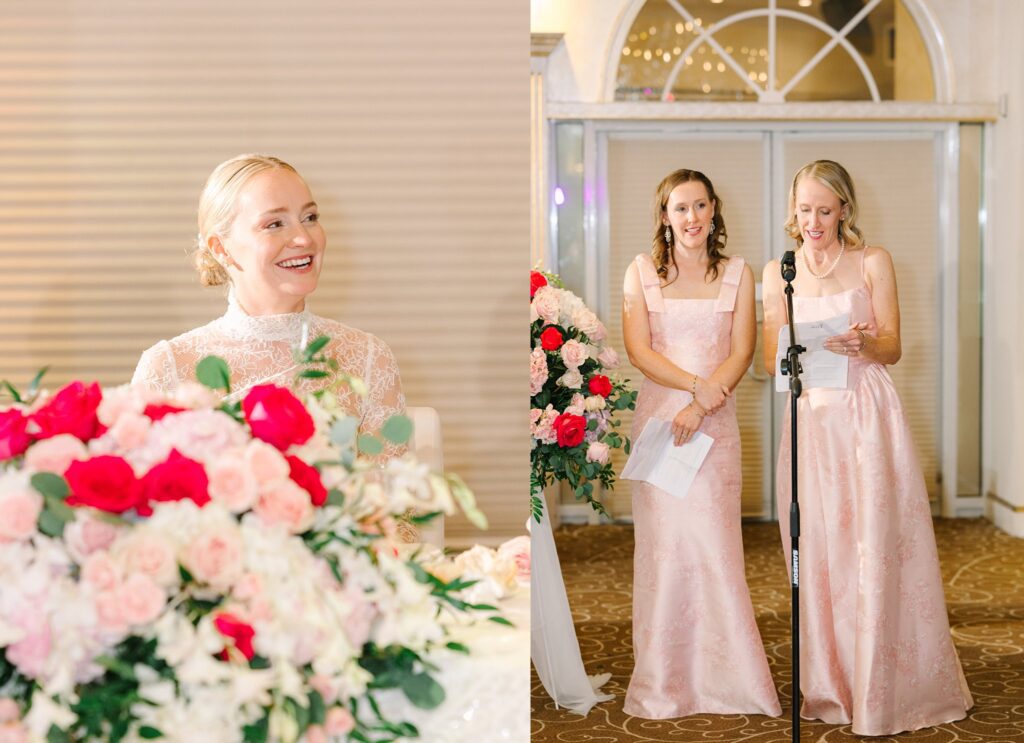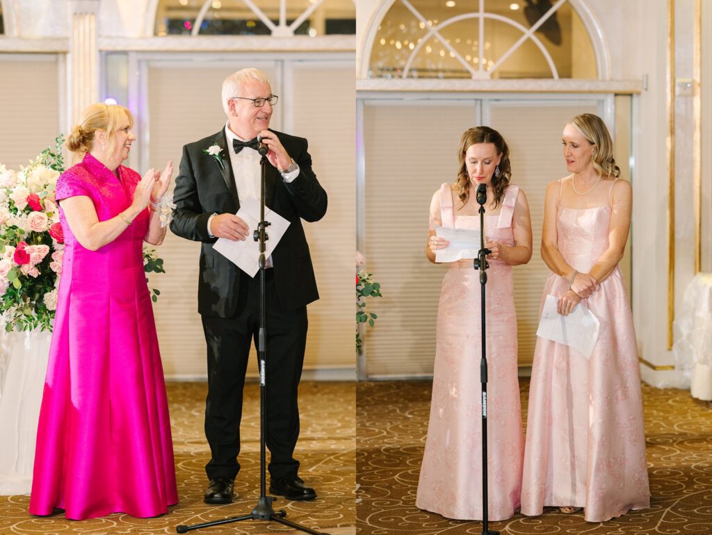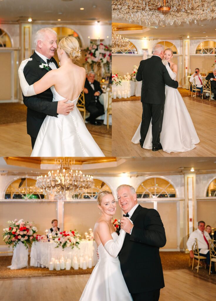 As the cocktail hour came to a close, and guests entered the ballroom. Guests were greeted with a timeless setting for their reception, adorned with crystal chandeliers and soft pink and white florals. Erin and Gordon’s joyful entrance set the tone for an evening filled with celebration, culminating in a packed dance floor that carried the energy well into the night!
